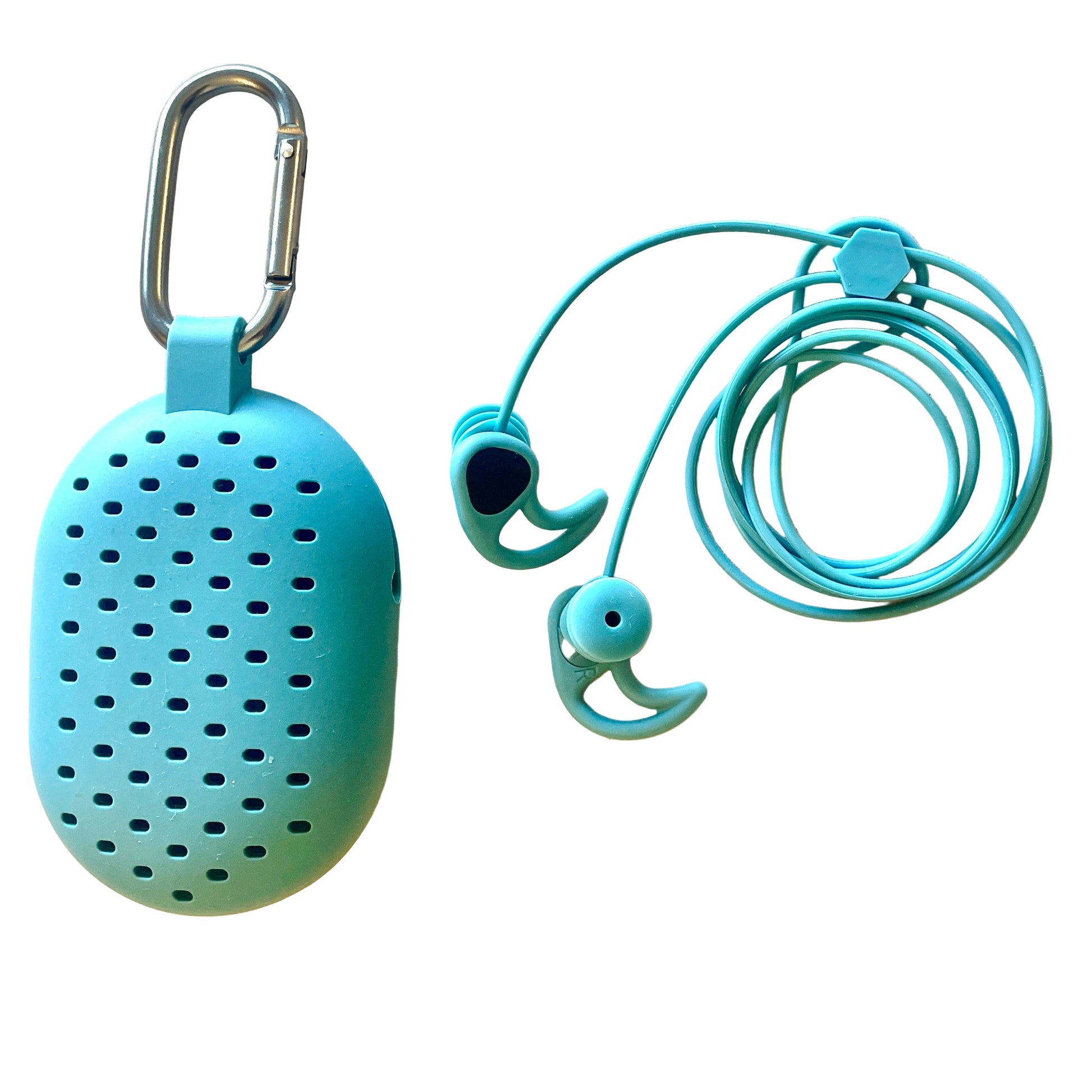 A silicone storage case with ventilation holes for drying and a little carabiner for attachment.